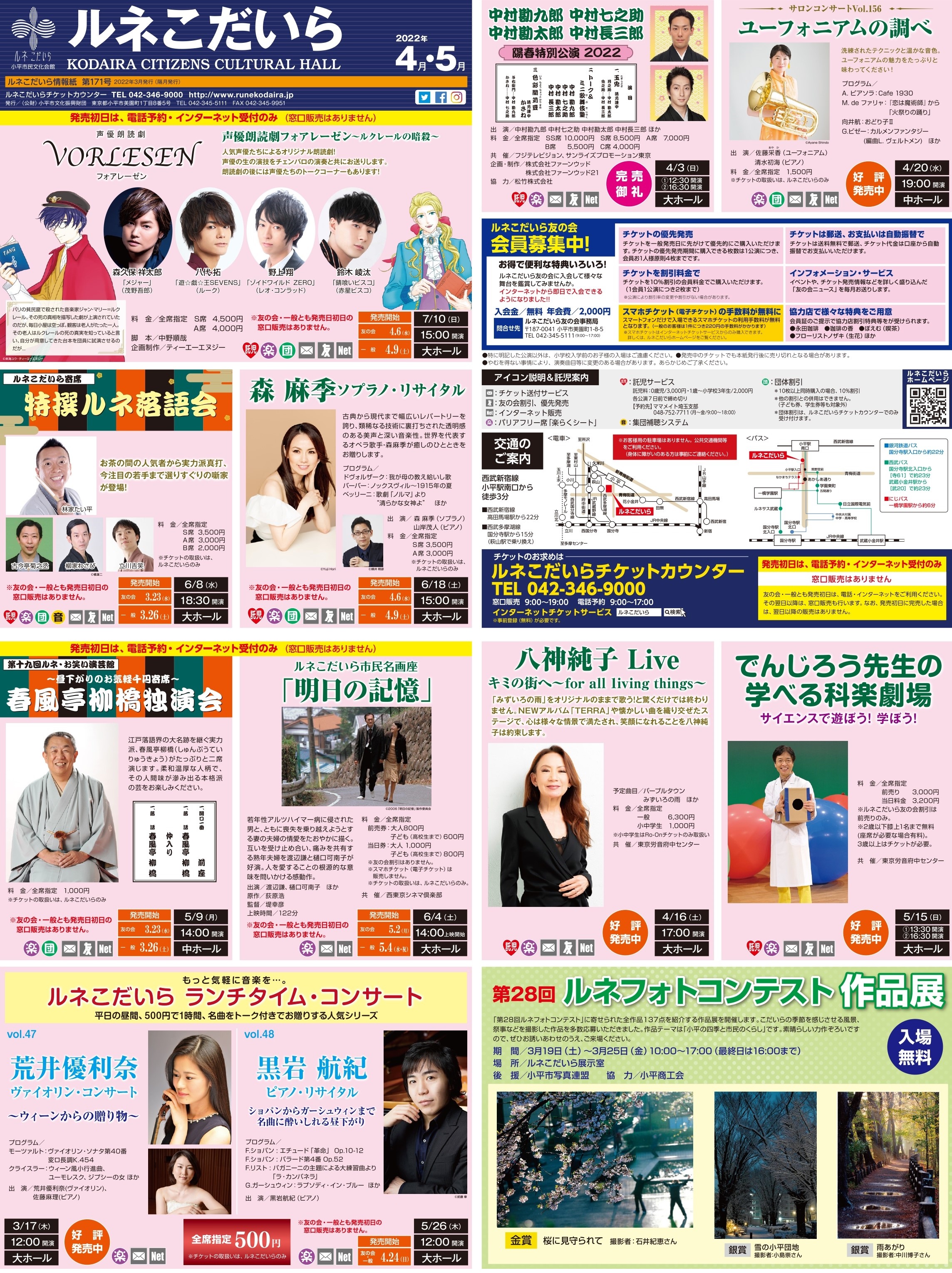 ルネこだいら情報紙2022年4月・5月号を発行しました。3月13日の新聞各紙朝刊に折り込んで配布をしているほか、ルネこだいら館内、小平市役所、小平市立公民館・図書館などの小平市の施設などでも配布しています。