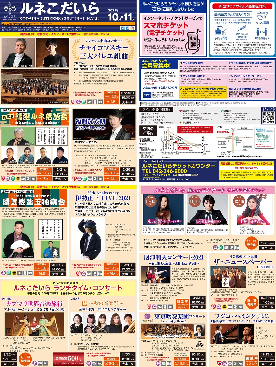 ルネこだいら情報紙2021年10月・11月号を発行しました。9月12日の新聞各紙朝刊に折り込んで配布をしているほか、ルネこだいら館内、小平市役所、小平市立公民館・図書館などの小平市の施設などでも配布しています。
