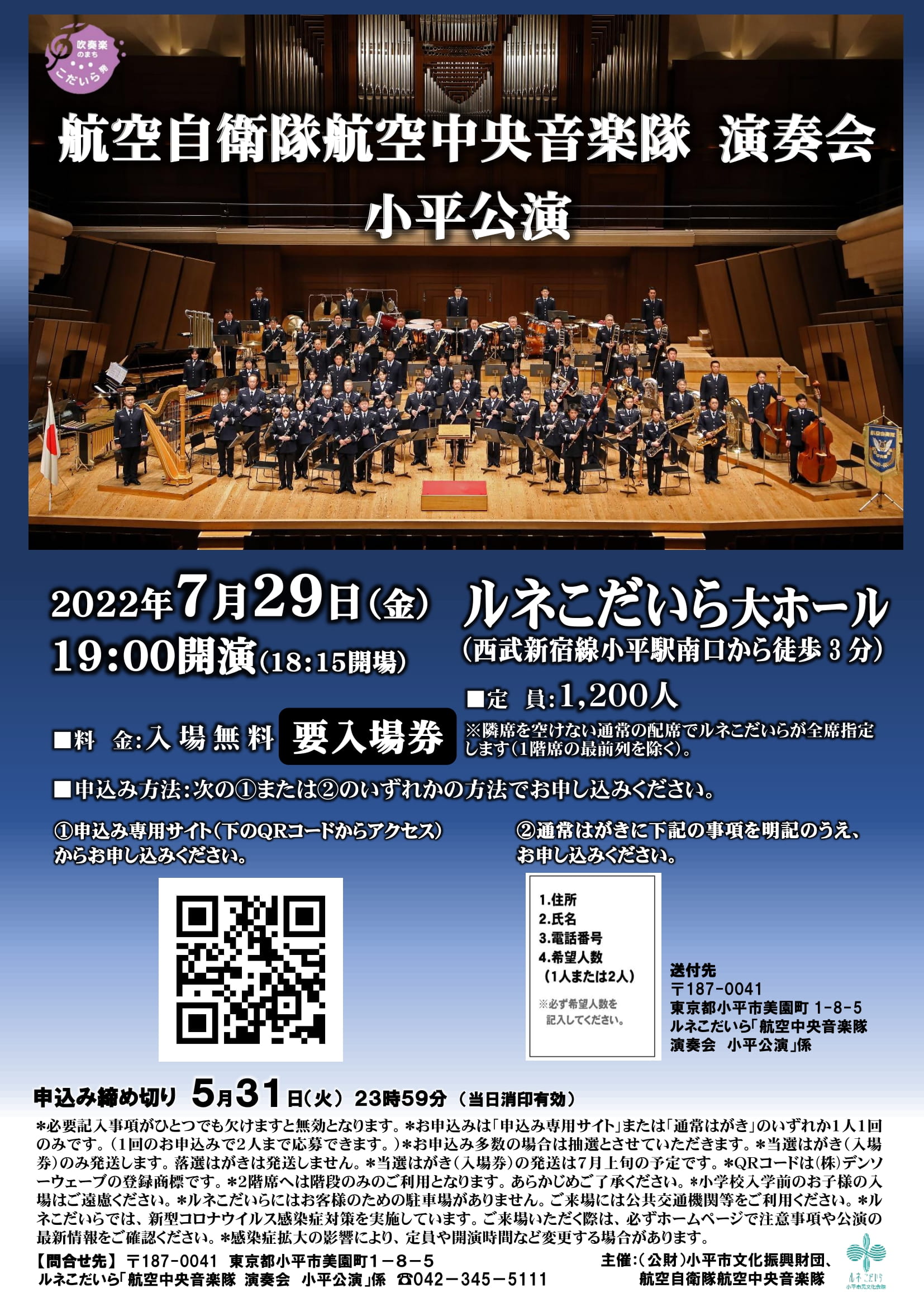2022年7月29日(金)にルネこだいら大ホールで開催を予定しておりました「航空自衛隊航空中央音楽隊 演奏会 小平公演」につきましては、公演関係者の新型コロナウイルス感染症の陽性が確認されたため、公演の中止を決定いたしました。
