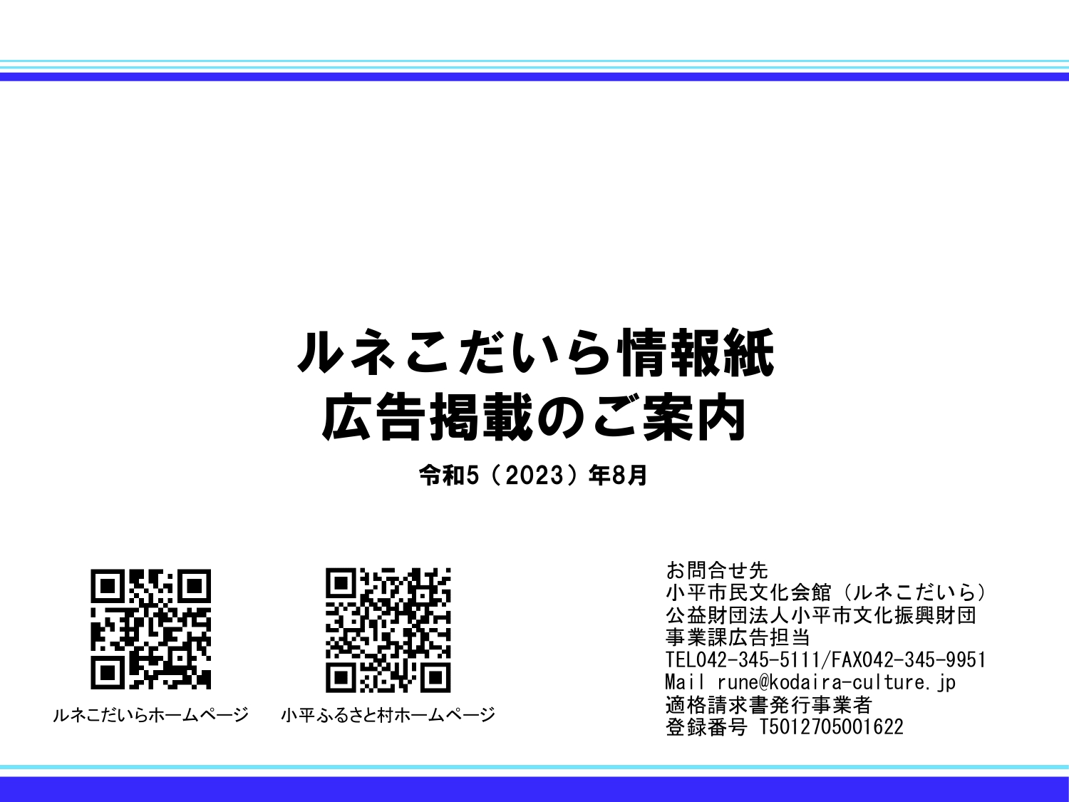 「ルネこだいら情報紙」は、ルネこだいらで開催する催し物情報などを掲載している広報紙です。 2か月に一度(奇数月)に発行し、新聞各紙朝刊に折り込んで配布をしているほか、ルネこだいら館内、小平市役所、小平市立公民館・図書館などの小平市の施設などでも配布しています。 小平を中心とした多摩地域への幅広いPR媒体としてぜひご利用ください。