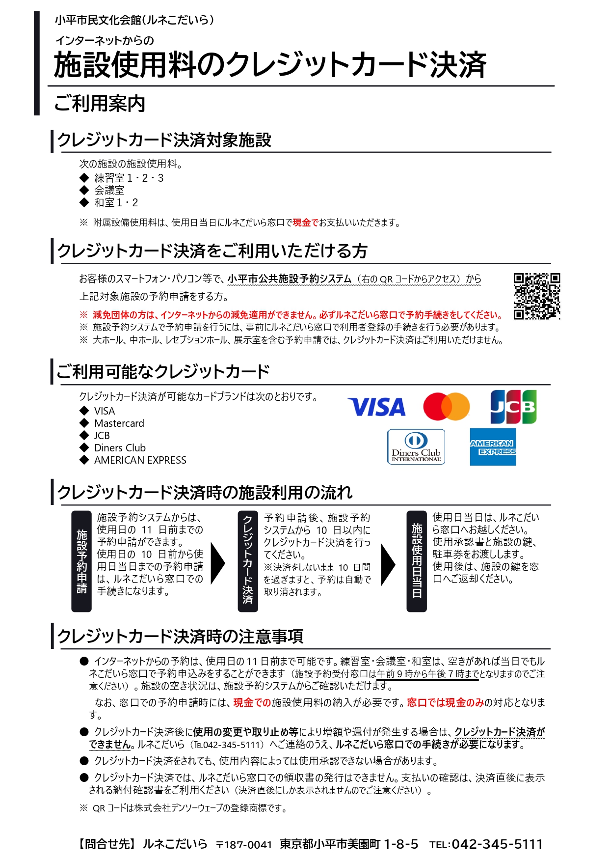 2024年6月17日(月)から、ルネこだいらの施設使用料の支払いを、インターネットからクレジットカードで決済できるようになりました。