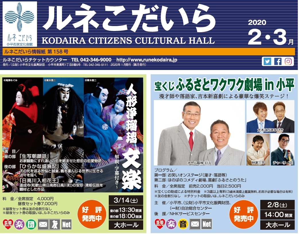ルネこだいら情報紙 2020年2月・3月号を発行しました。1月12日の新聞各紙朝刊に折り込んで配布をしているほか、ルネこだいら館内、小平市役所、小平市立公民館・図書館などの小平市の施設などでも配布しています。