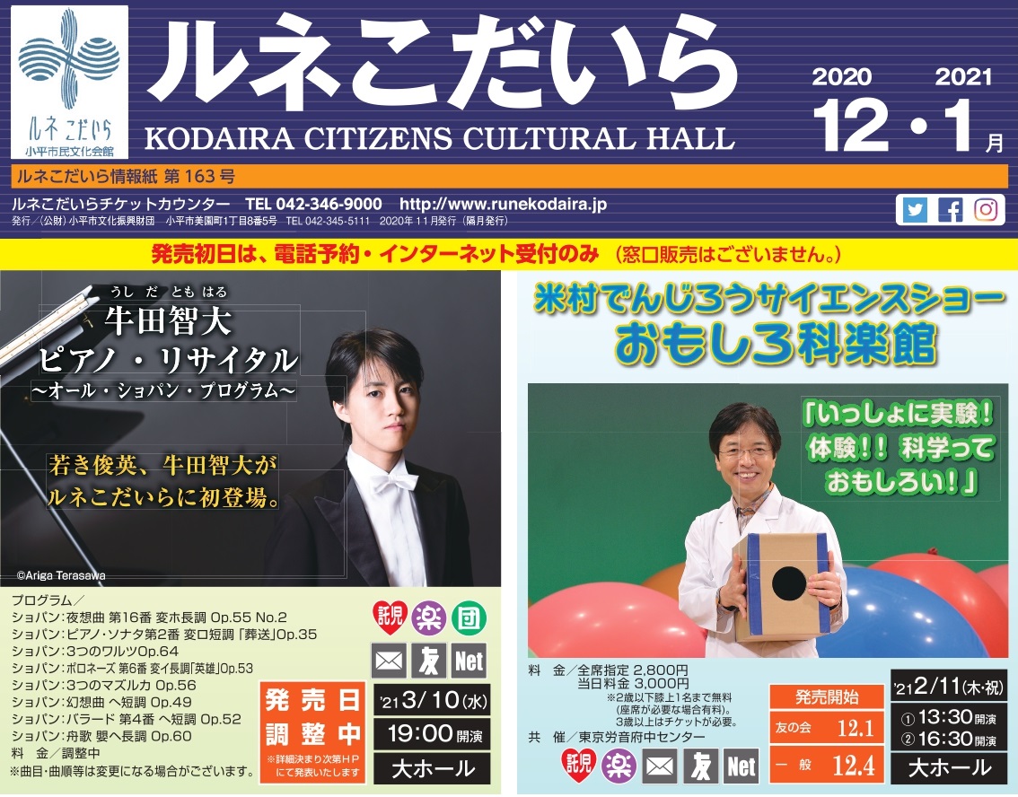 ルネこだいら情報紙2020年12月・2021年1月号を発行しました。11月15日の新聞各紙朝刊に折り込んで配布をしているほか、ルネこだいら館内、小平市役所、小平市立公民館・図書館などの小平市の施設などでも配布しています。