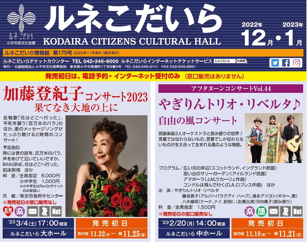 ルネこだいら情報紙2022年12月・2023年1月号を発行しました。11月13日の新聞各紙朝刊に折り込んで配布をしているほか、ルネこだいら館内、小平市役所、小平市立公民館・図書館などの小平市の施設などでも配布しています。