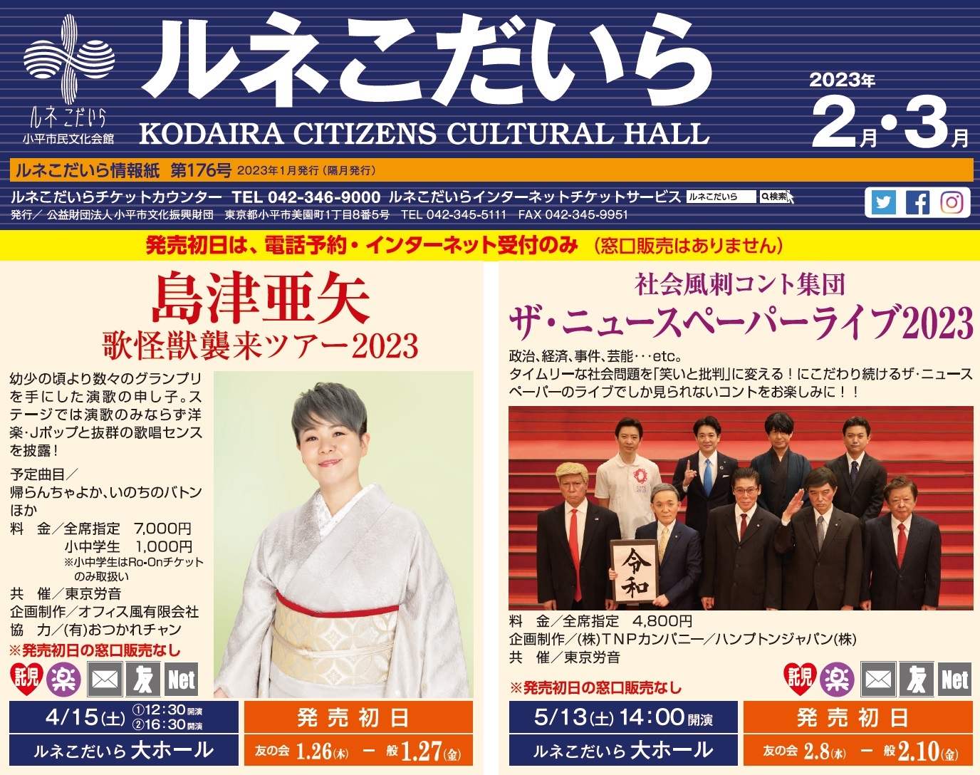 ルネこだいら情報紙2023年2月・3月号を発行しました。1月15日の新聞各紙朝刊に折り込んで配布をしているほか、ルネこだいら館内、小平市役所、小平市立公民館・図書館などの小平市の施設などでも配布しています。