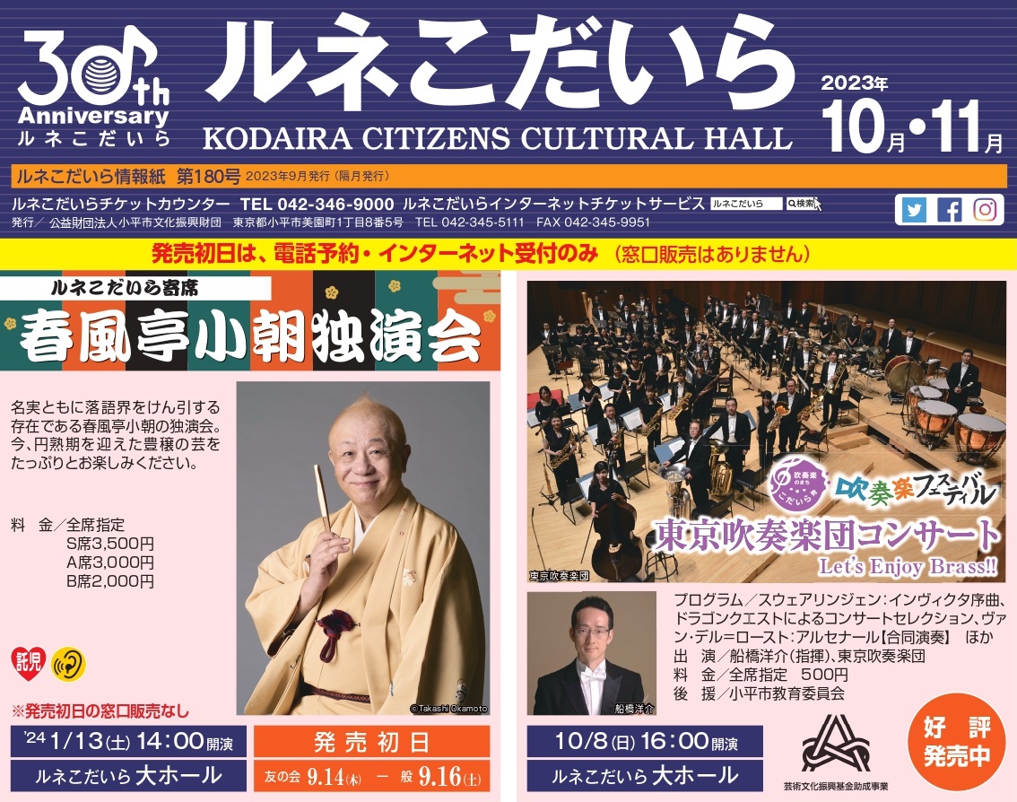 ルネこだいら情報紙 2023年10月・11月号を発行しました。9月10日の新聞各紙朝刊に折り込んで配布をしているほか、ルネこだいら館内、小平市役所、小平市立公民館・図書館などの小平市の施設などでも配布しています。