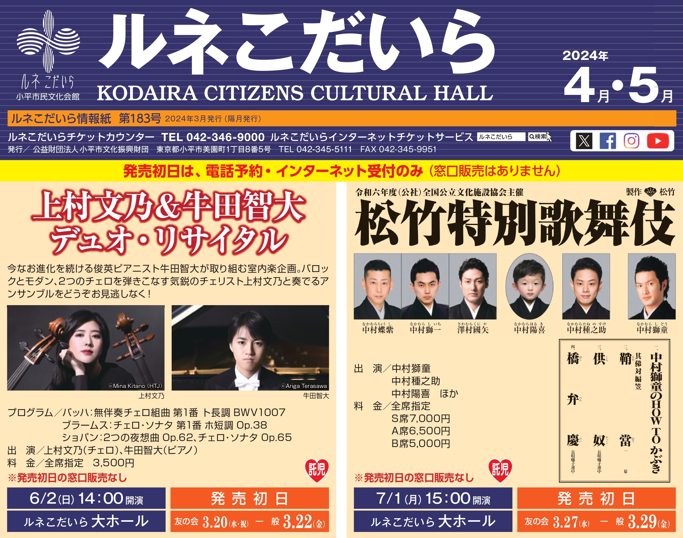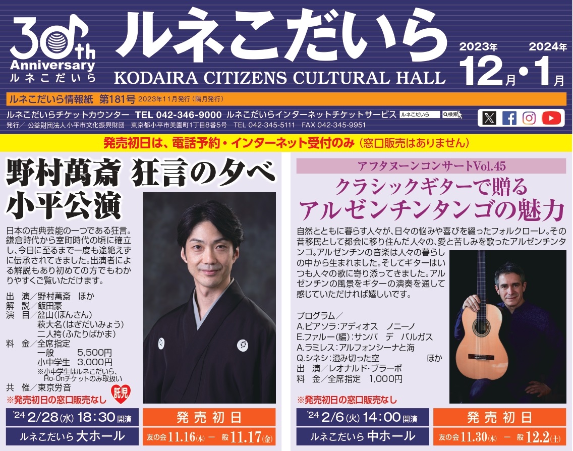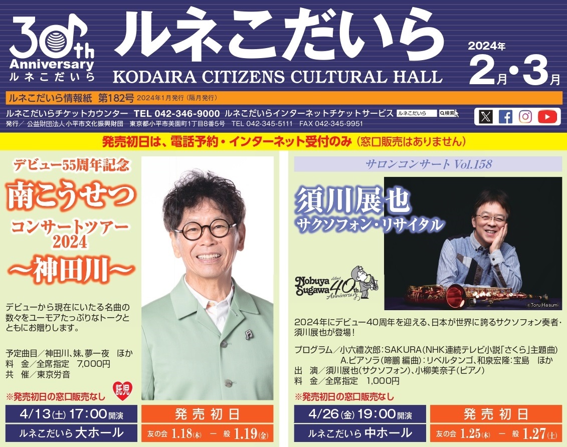 ルネこだいら情報紙2024年2月・3月号を発行しました。1月14日の新聞各紙朝刊に折り込んで配布をしているほか、ルネこだいら館内、小平市役所、小平市立公民館・図書館などの小平市の施設などでも配布しています。