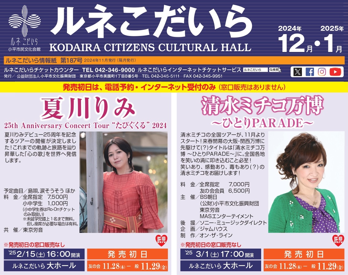 ルネこだいら情報紙 2024年12月・2025年1月号を発行しました。11月10日の新聞各紙朝刊に折り込んで配布をしているほか、ルネこだいら館内、小平市役所、小平市立公民館・図書館などの小平市の施設などでも配布しています。