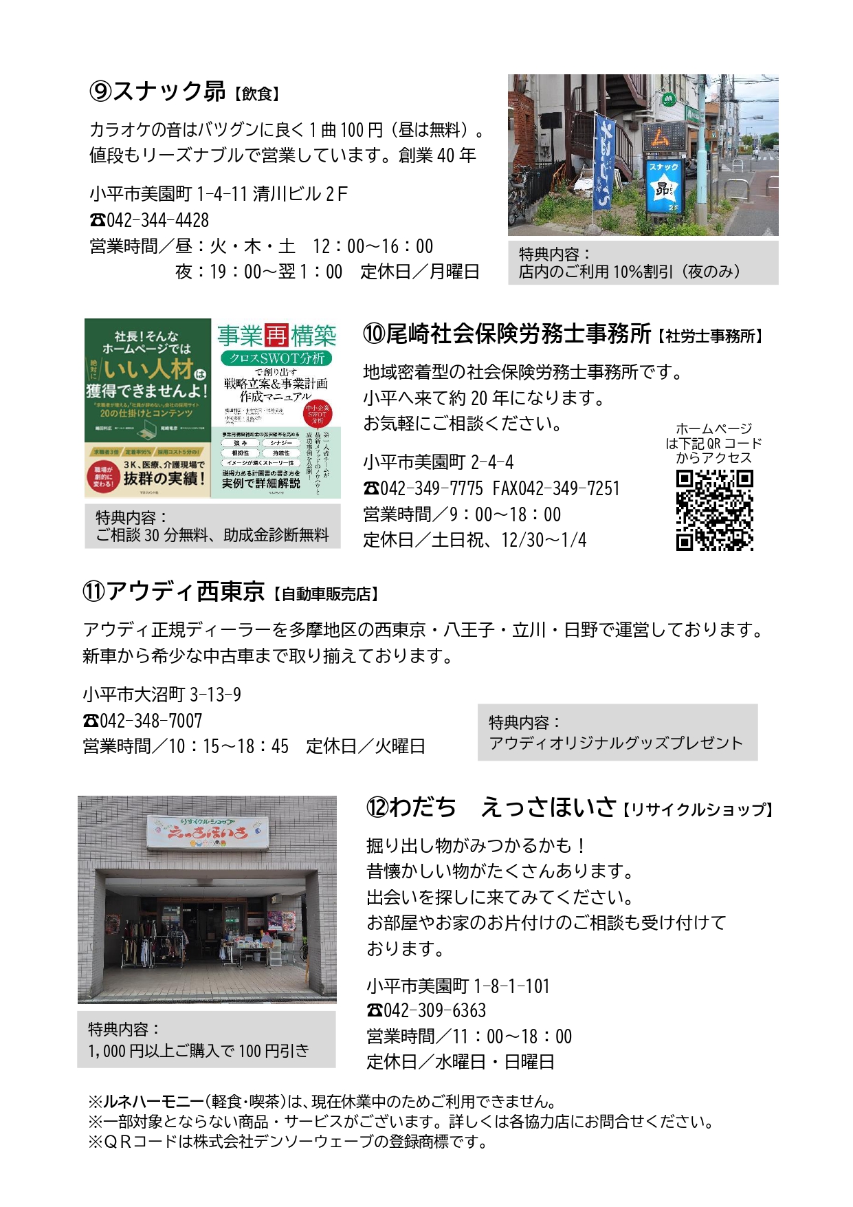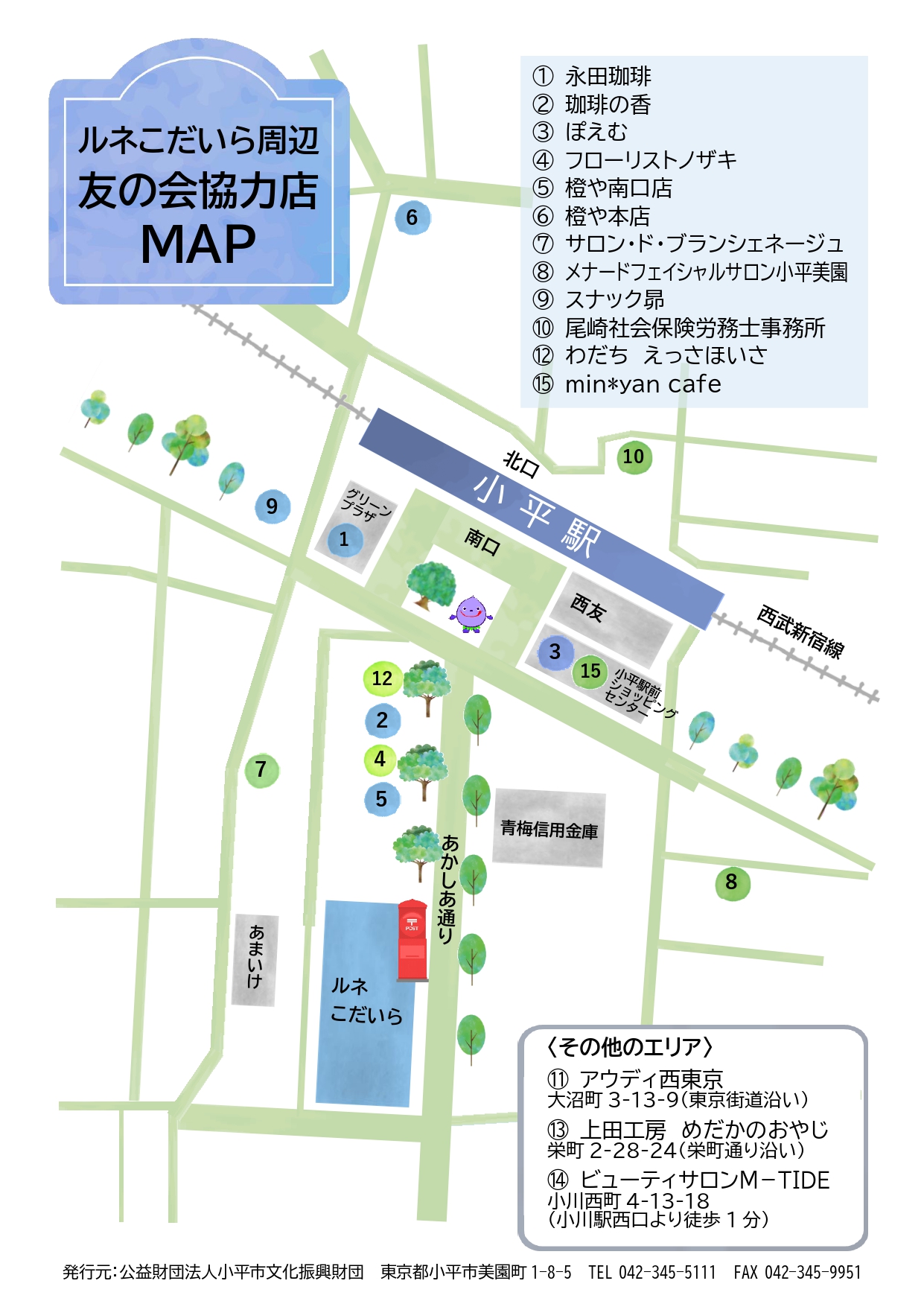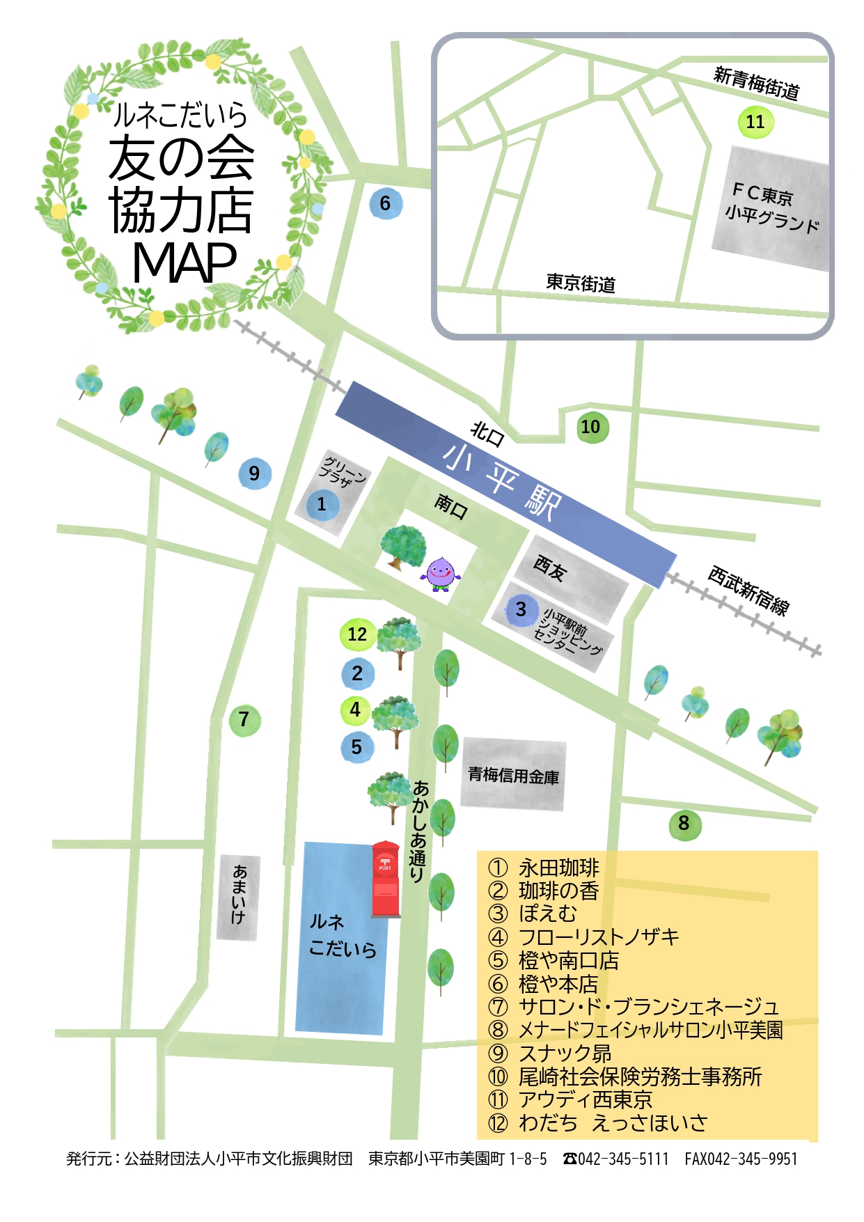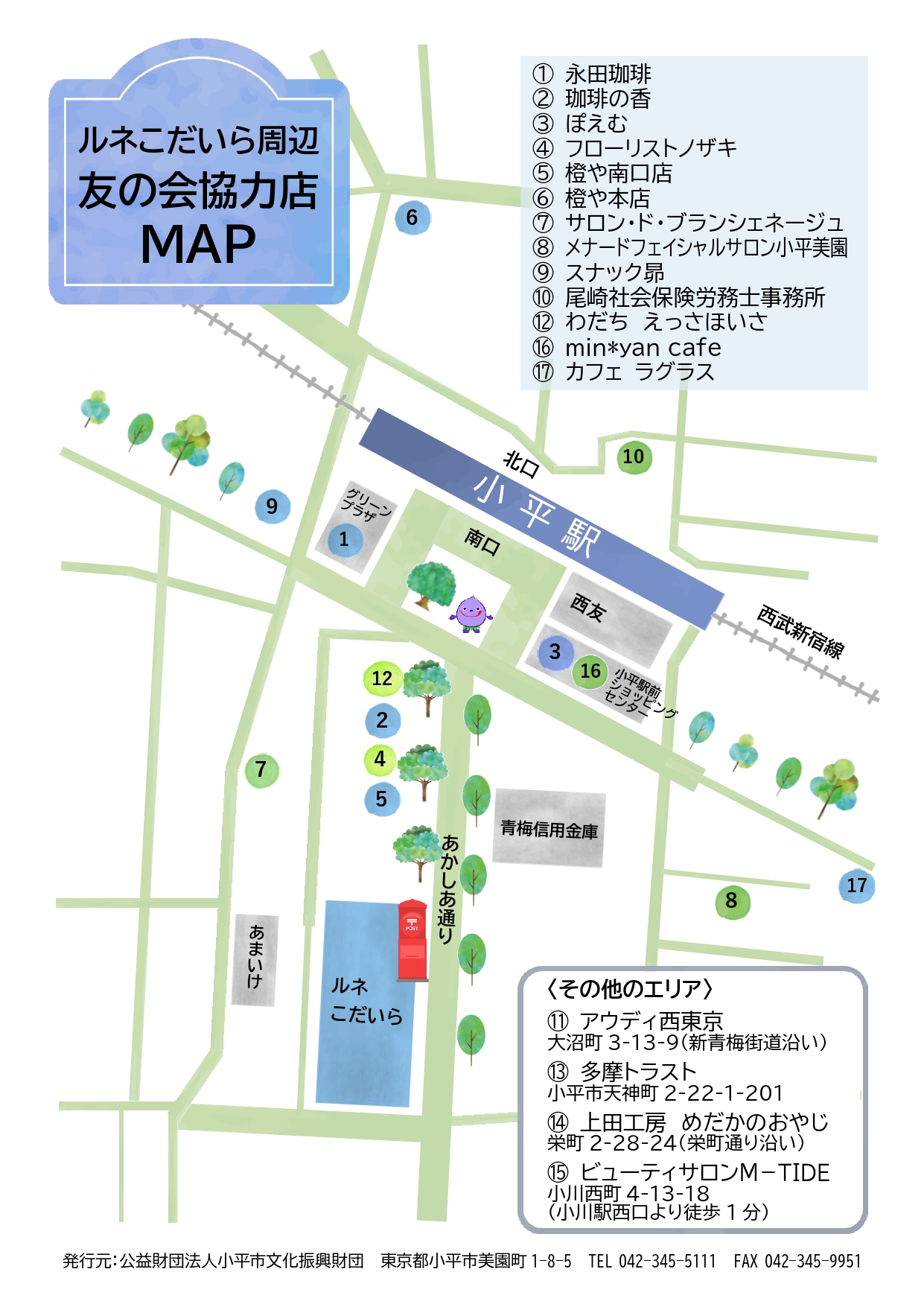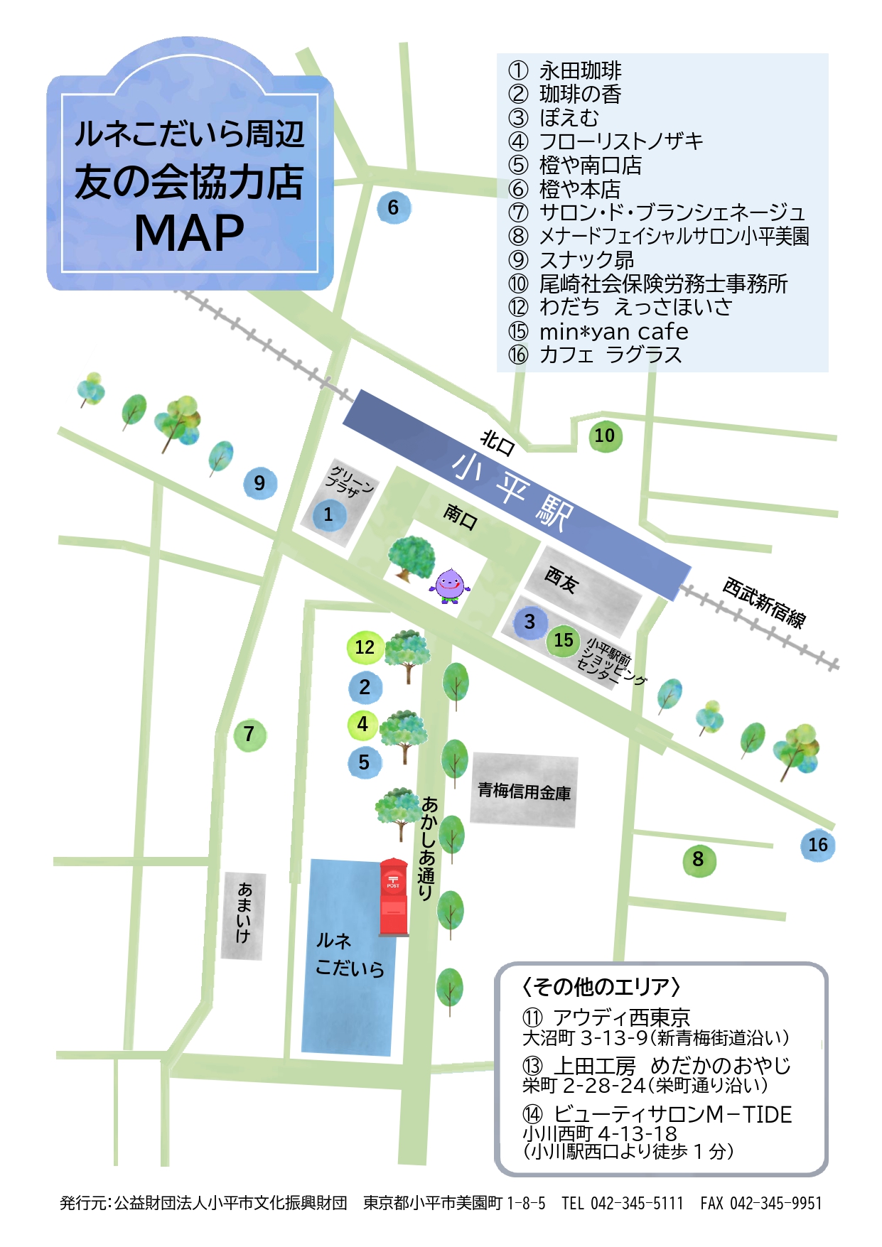 ・持ち物:ルネこだいら友の会入会申込書、年会費、金融機関口座番号がわかるもの(通帳など)、金融機関口座届出印
