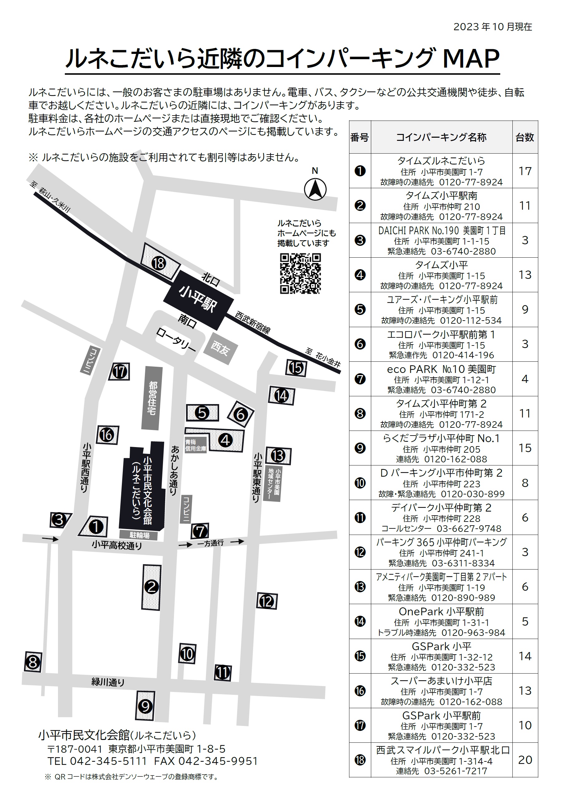 ルネこだいら近隣のコインパーキング(2023年10月現在)
