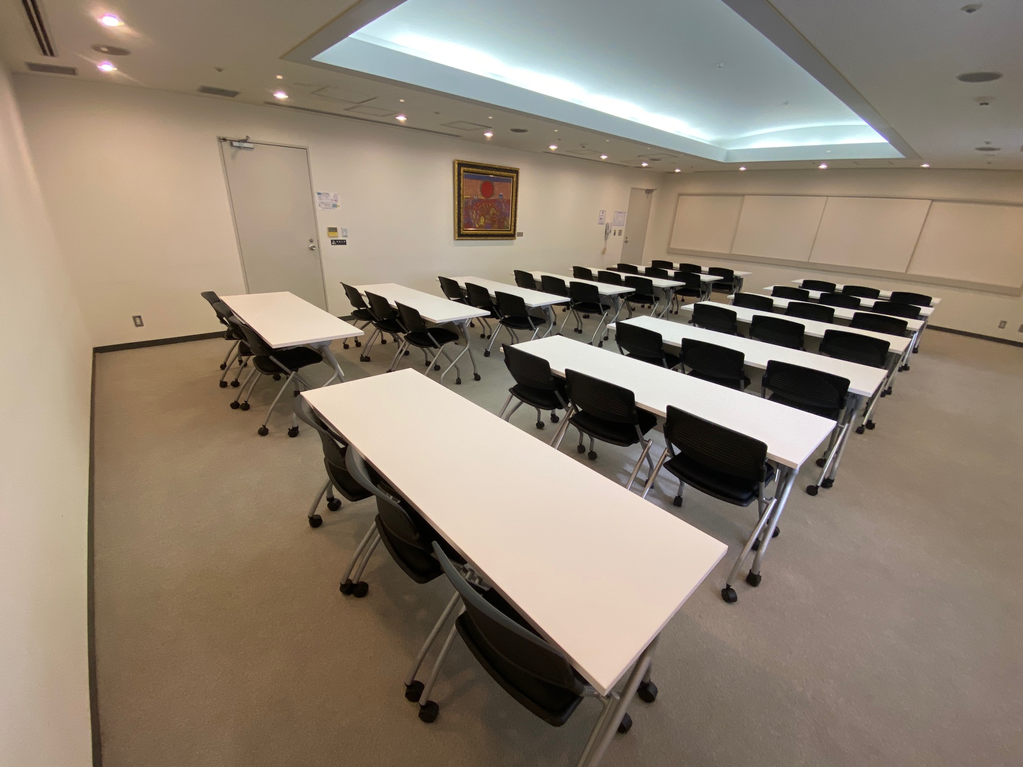 落ち着いた雰囲気の内装を施した、移動可能なキャスター付き長机と椅子42脚を備えている会議室です。