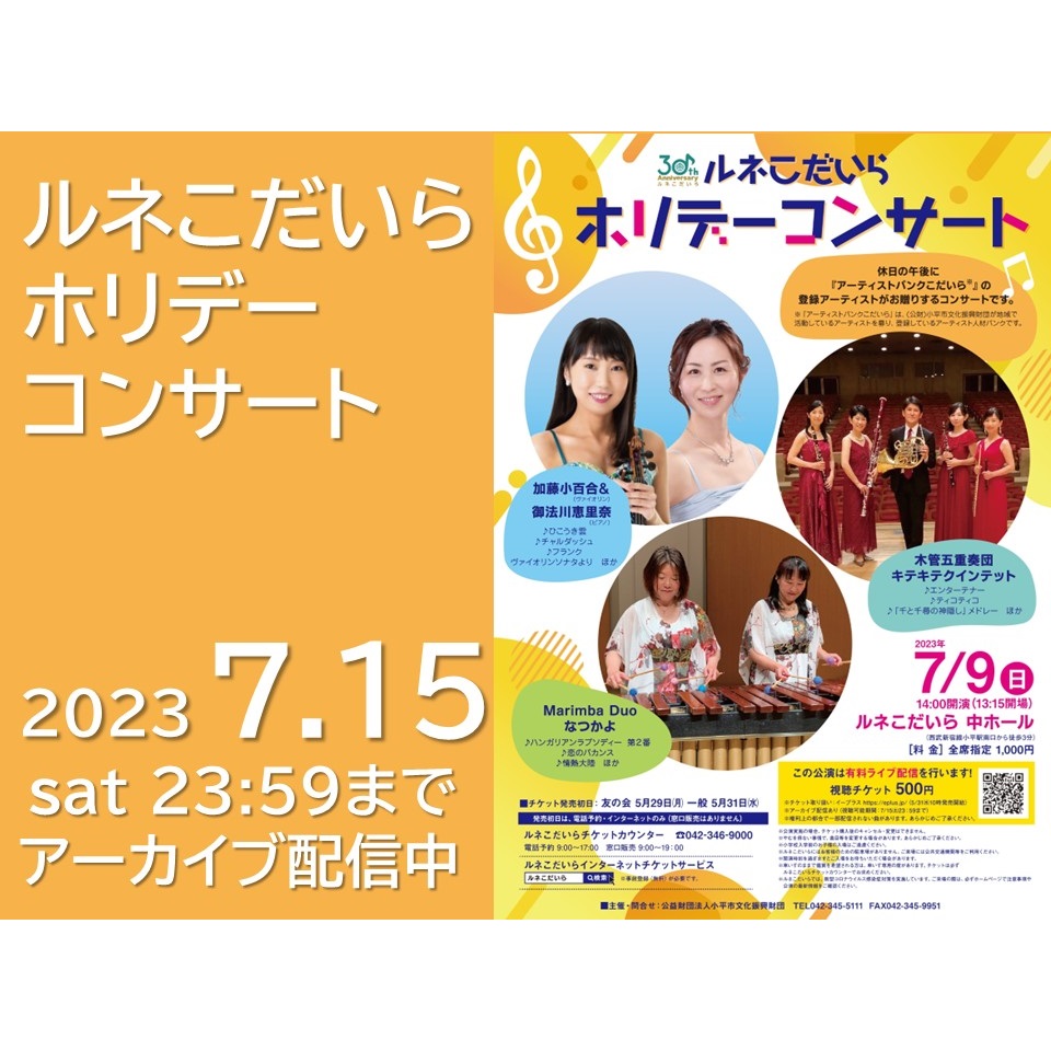 7月9日(日)の「ルネこだいらホリデーコンサート」の公演は、アーカイブ配信でもご視聴いただだけます。(視聴料500円)