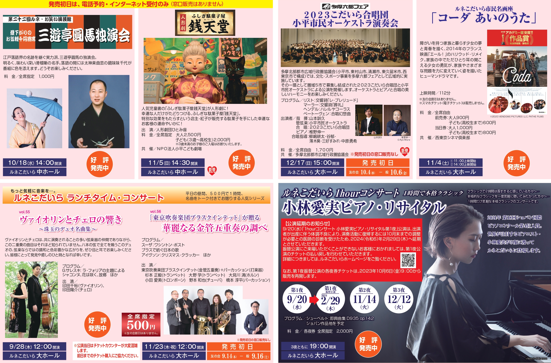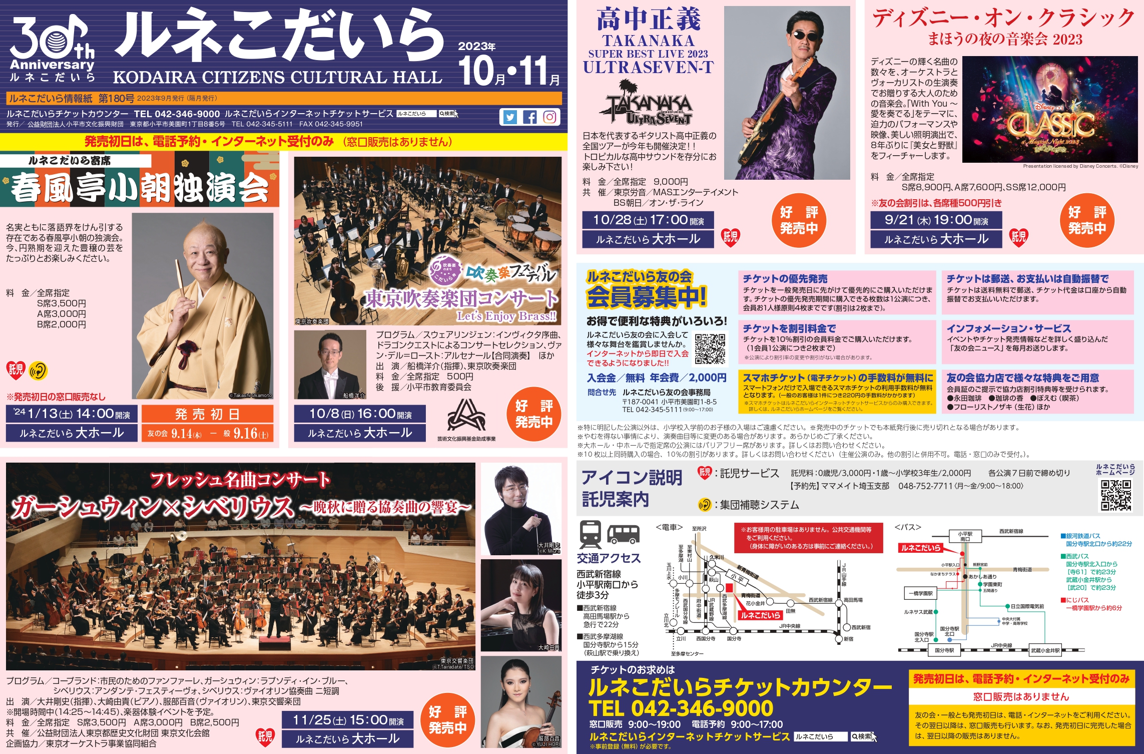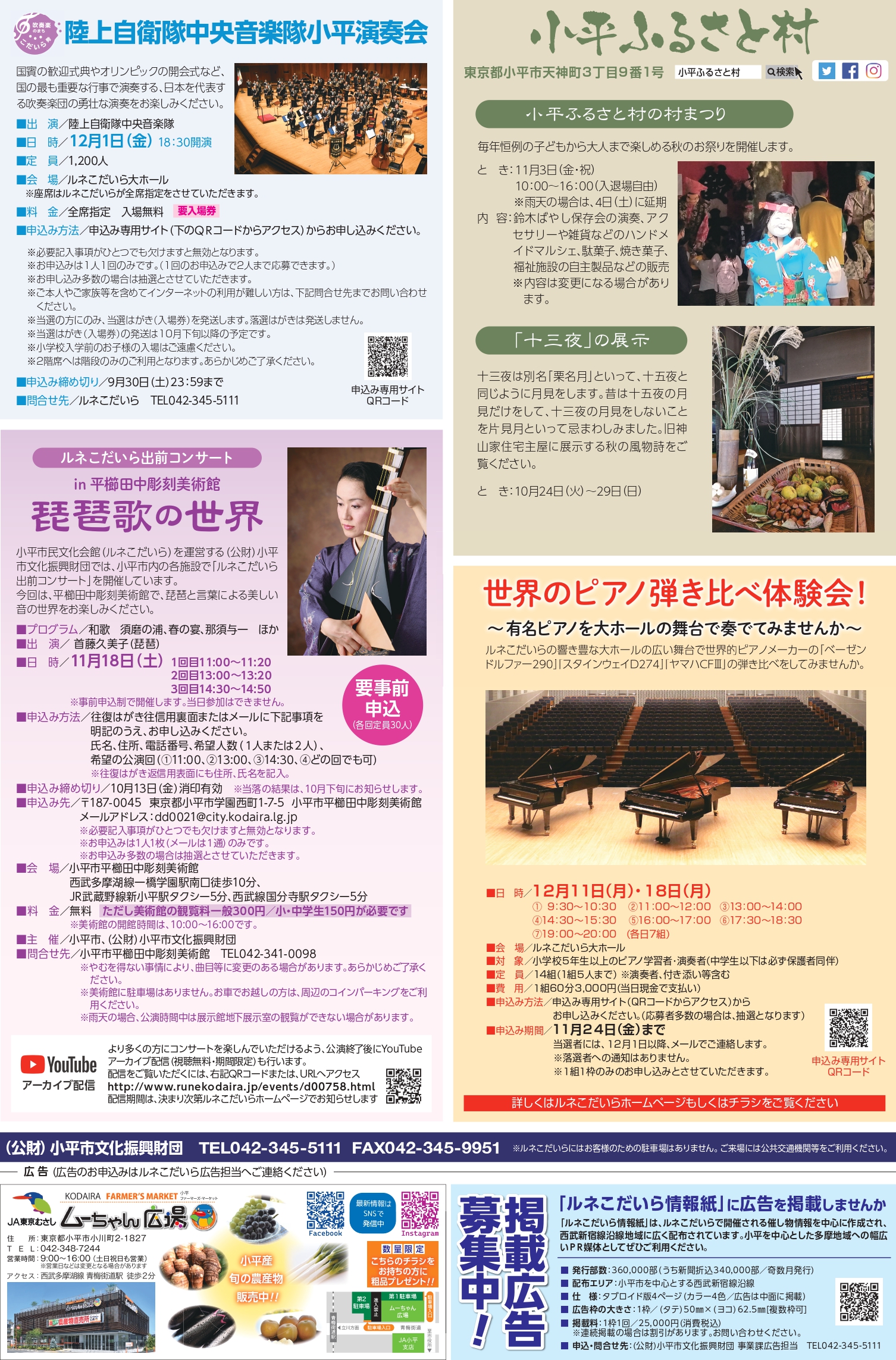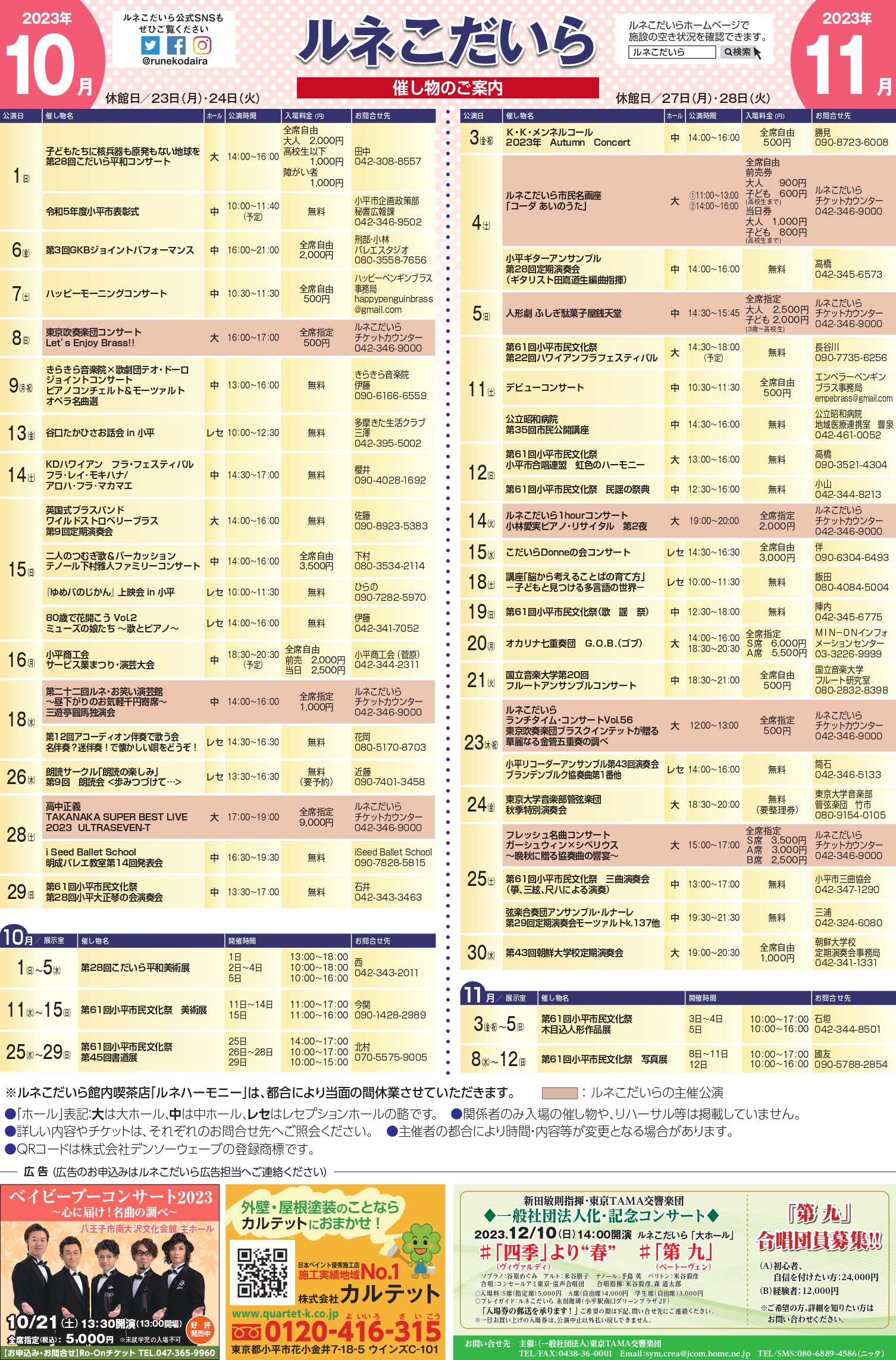 ルネこだいら情報紙 2023年10月・11月号を発行しました。9月10日の新聞各紙朝刊に折り込んで配布をしているほか、ルネこだいら館内、小平市役所、小平市立公民館・図書館などの小平市の施設などでも配布しています。