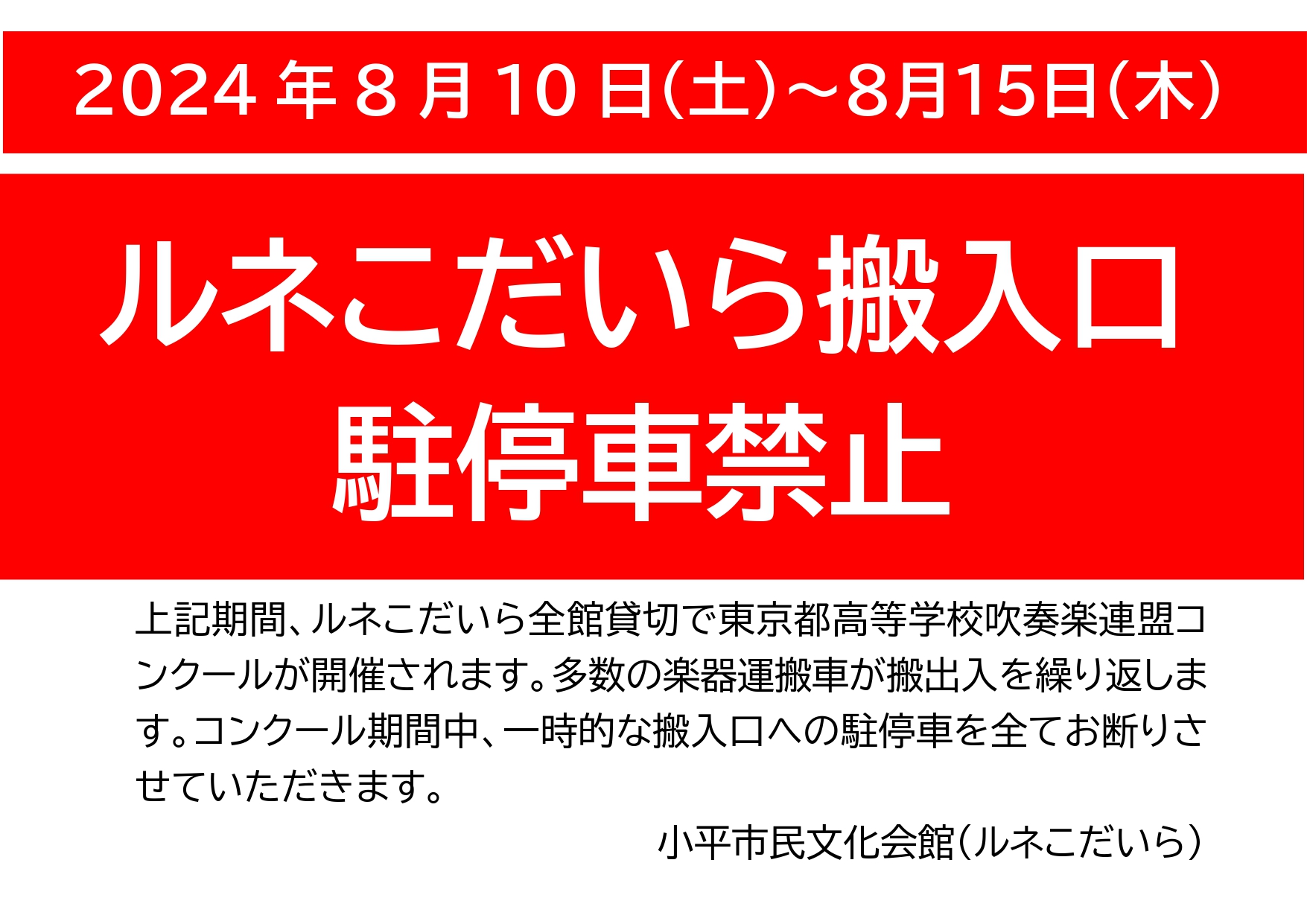2024年8月10日(土)から15日(木)まで、ルネこだいら全館貸し切りで、東京都高等学校吹奏楽連盟コンクールが開催されます。コンクール期間中、多数の楽器運搬車が搬入出を繰り返します。
