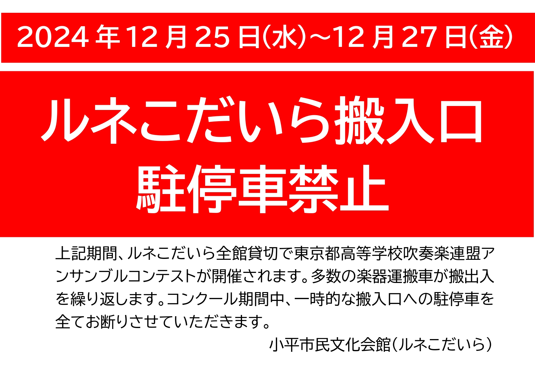 2024年12月25日(水)から27日(金)まで、ルネこだいら全館貸し切りで、東京都高等学校吹奏楽連盟アンサンブルコンテストが開催されます。コンクール期間中、多数の楽器運搬車が搬入出を繰り返します。