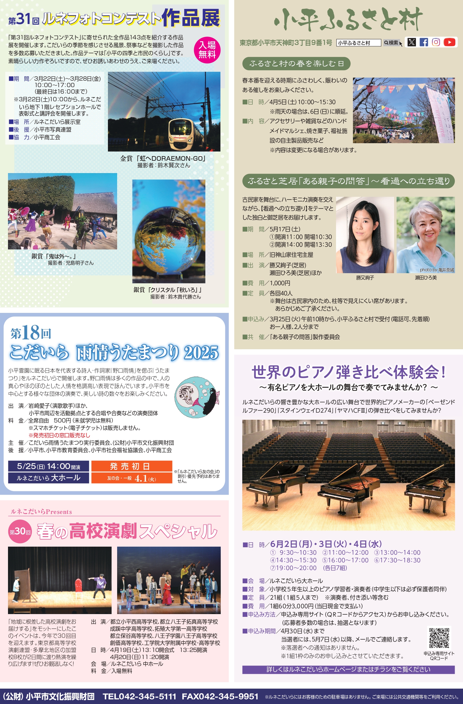 ルネこだいら情報紙 2025年4月・5月号を発行しました。3月9日の新聞各紙朝刊に折り込んで配布をしているほか、ルネこだいら館内、小平市役所、小平市立公民館・図書館などの小平市の施設などでも配布しています。