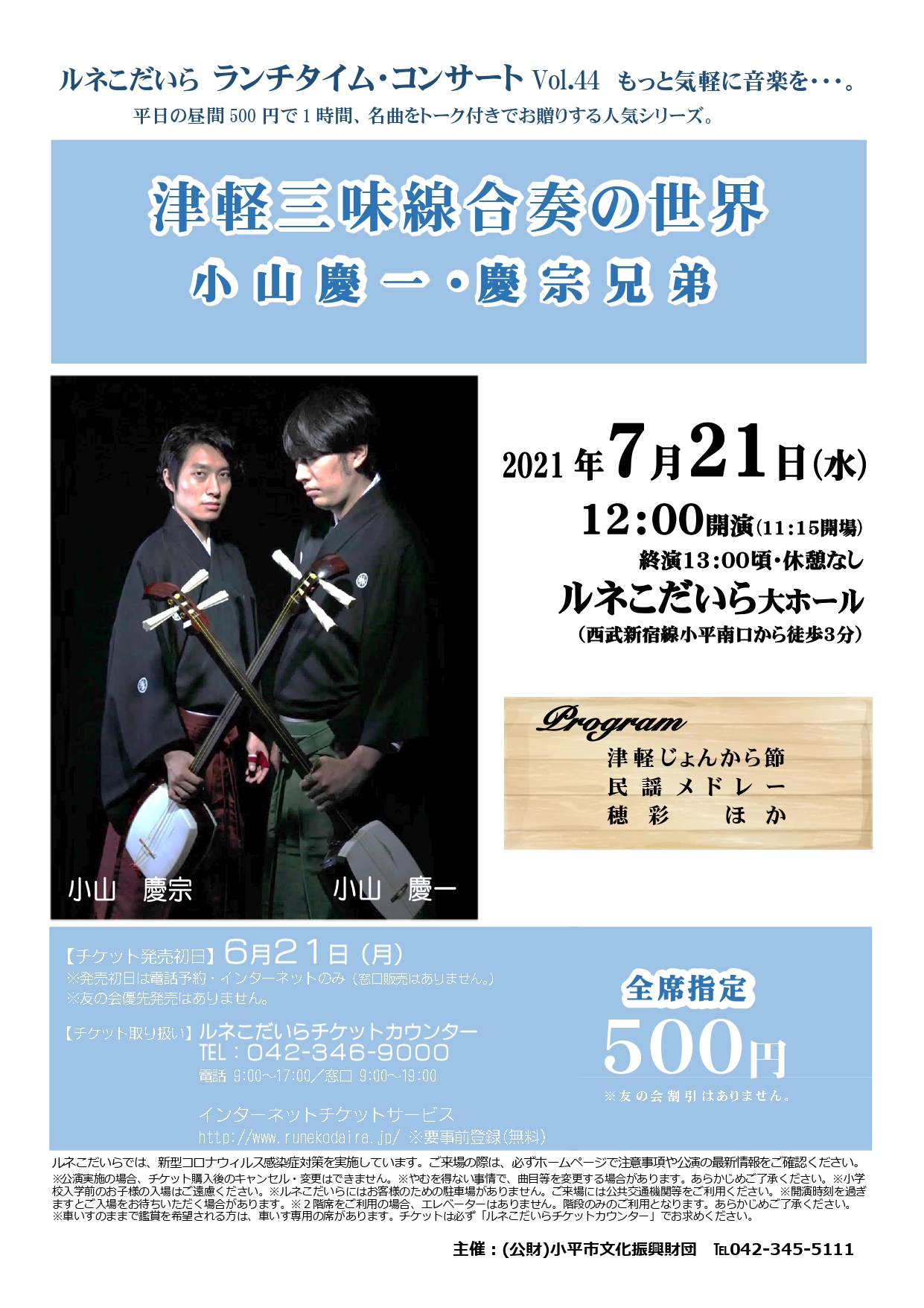 若手で注目される津軽三味線奏者、小山慶一・慶宗の兄弟による合奏の世界をお届けします。