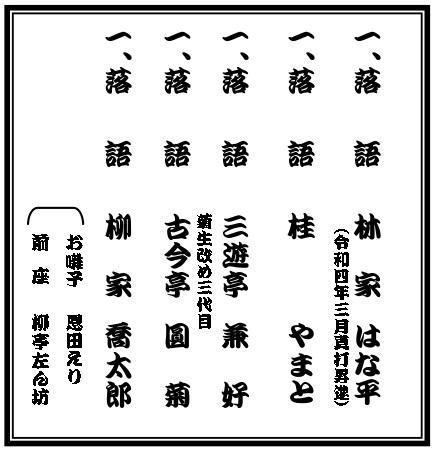 演目は、林家はな平「権兵衛狸」、桂やまと「時そば」、三遊亭兼好「壺算」、古今亭圓菊「幾代餅」、柳家喬太郎「親子酒」でした。