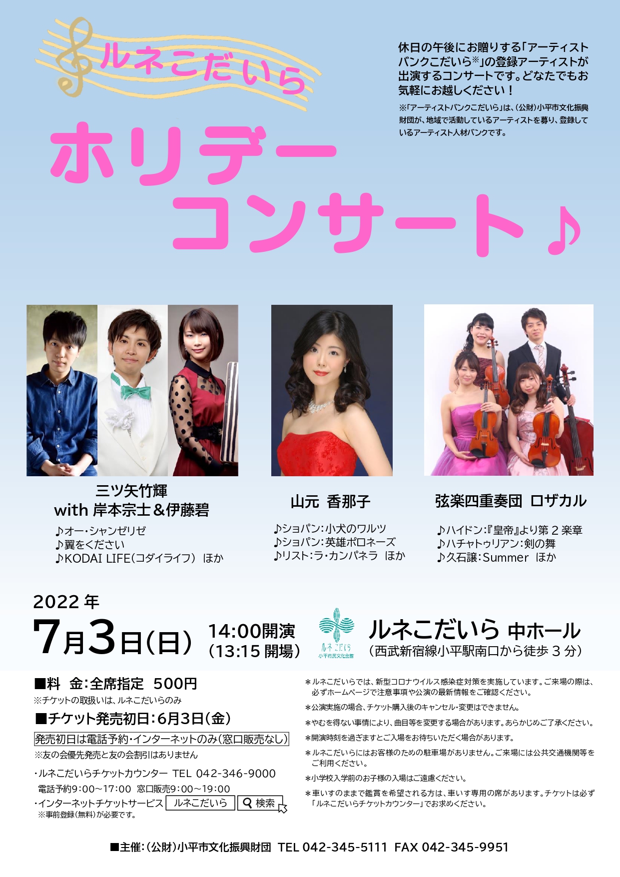 休日の午後にお贈りする「アーティストバンクこだいら」の登録アーティストが出演するコンサートです。今回は、三ツ矢竹輝with岸本宗士&伊藤碧、山元香那子、弦楽四重奏団ロザカルの3組が出演します。