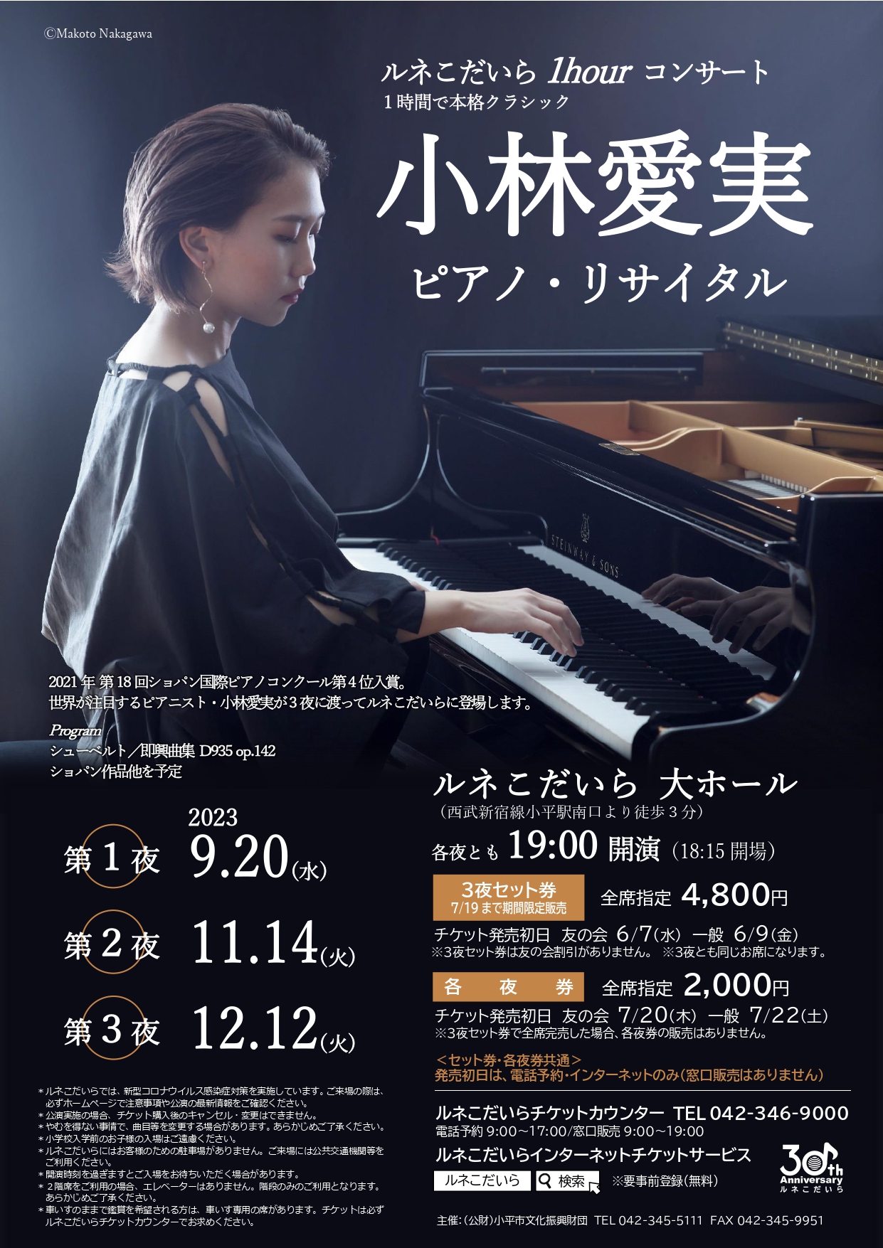 世界が注目するピアニスト・小林愛実が3夜に渡ってルネこだいらに登場します。