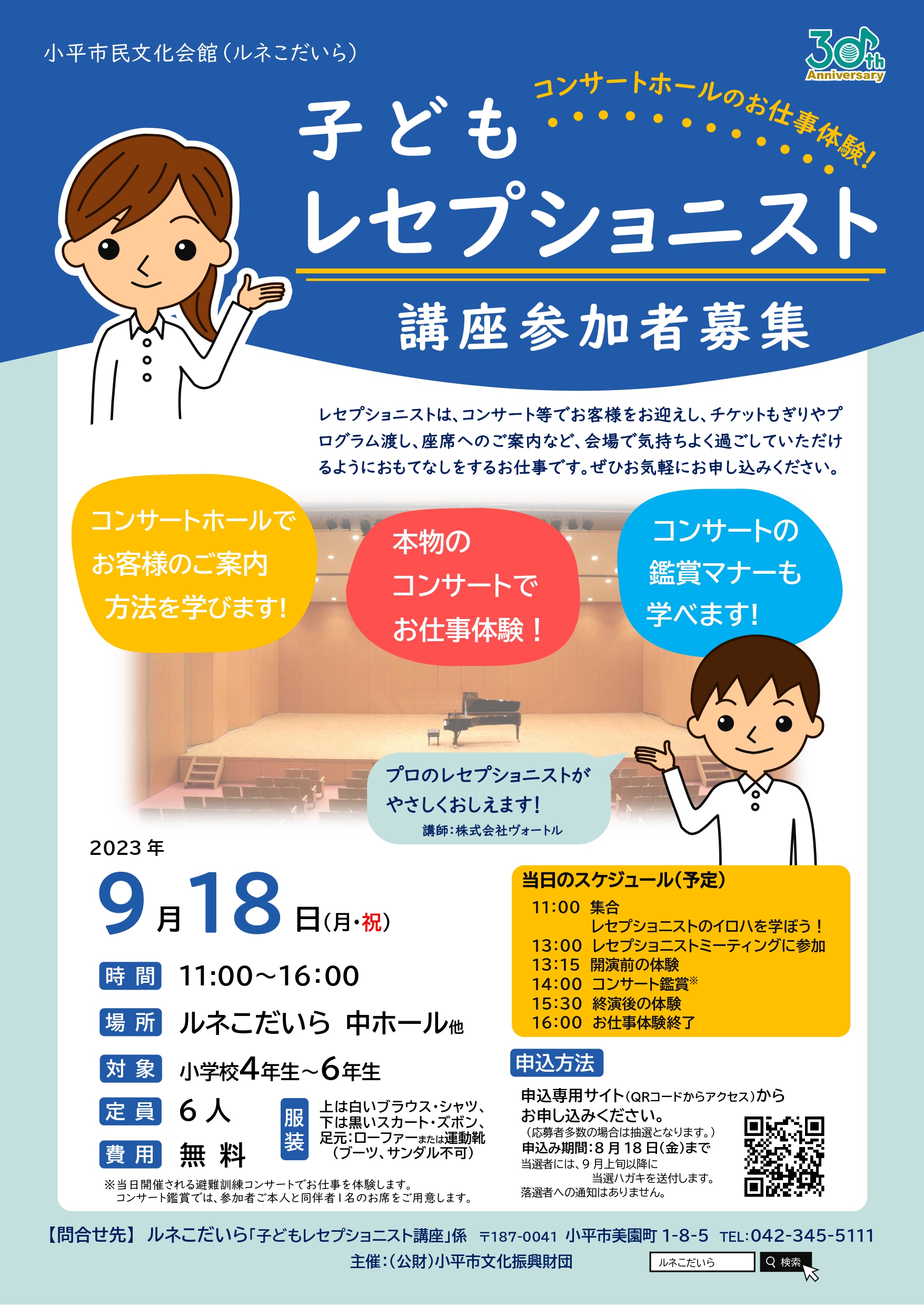 レセプショニストは、コンサート等でお客様をお迎えし、チケットもぎりやプログラム渡し、座席へのご案内など、会場で気持ちよく過ごしていただけるようにおもてなしをするお仕事です。ぜひお気軽にお申し込みください。
