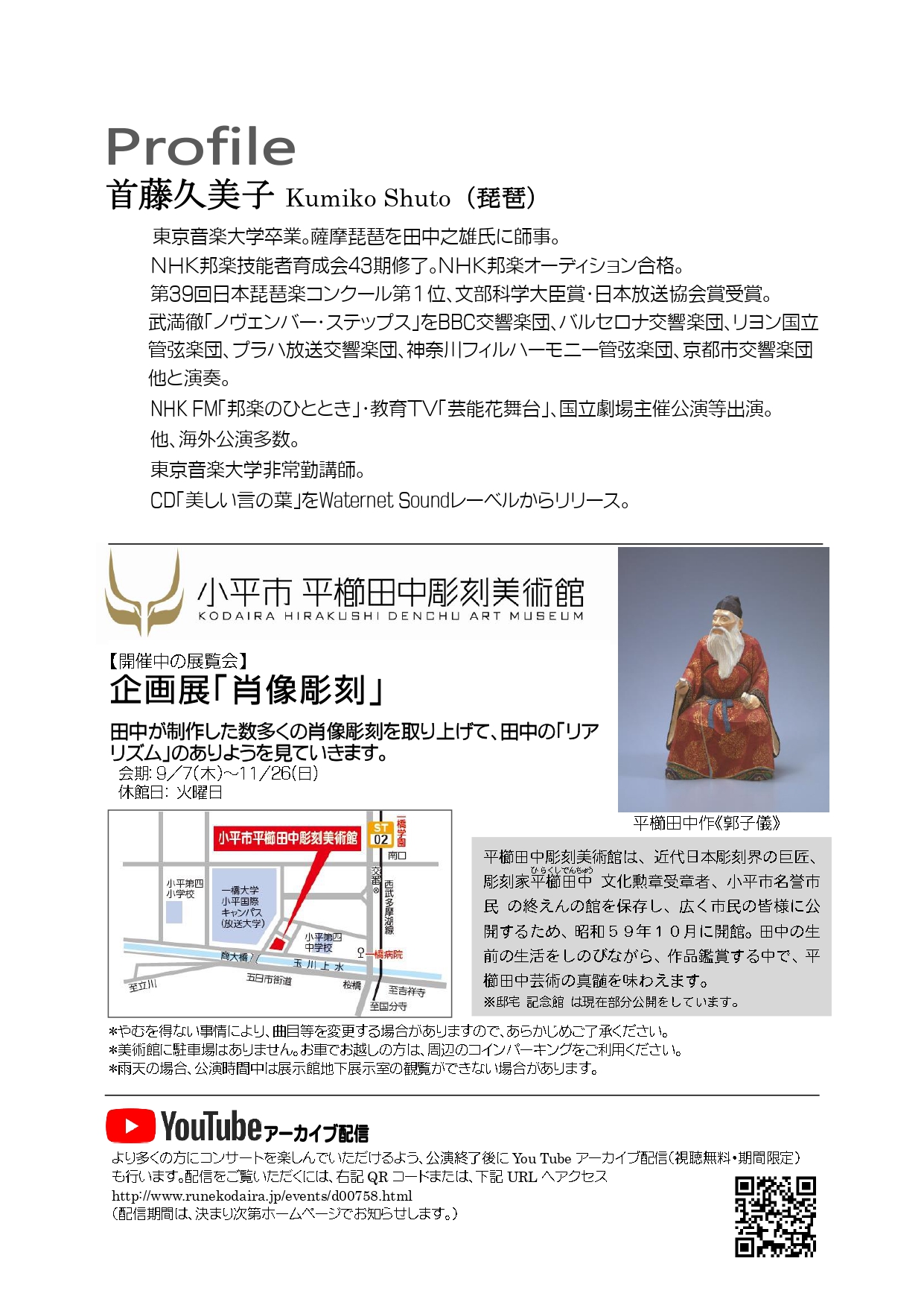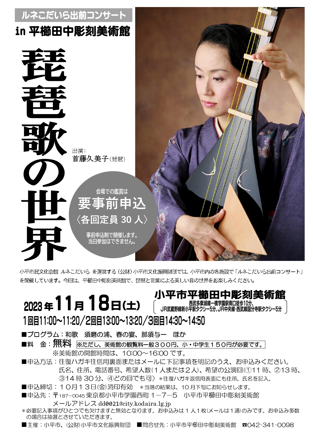 【アーカイブ配信/期間限定11/25~12/1】ルネこだいら出前コンサート 琵琶歌の世界(会場:平櫛田中彫刻美術館)