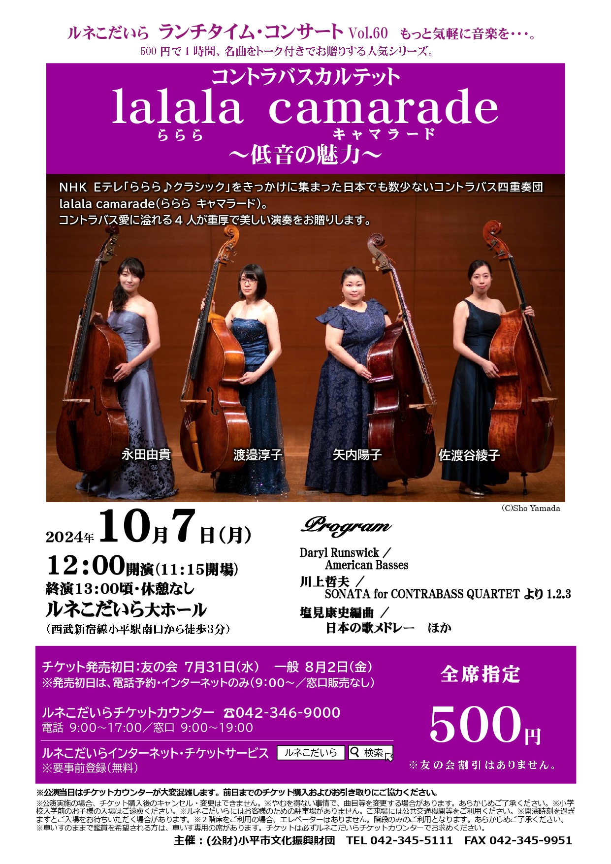 NHK Eテレ「ららら♪クラシック」をきっかけに集まった日本でも数少ないコントラバス四重奏団lalala camarade(らららキャマラード)。コントラバス愛に溢れる4人が重厚で美しい演奏をお贈りします。