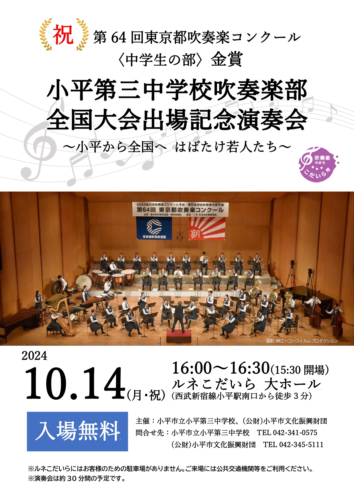 小平第三中学校吹奏楽部が、第64回東京都吹奏楽コンクール中学校の部で金賞を受賞し、全国大会への出場を決めたことを祝福する記念演奏会を開催します。