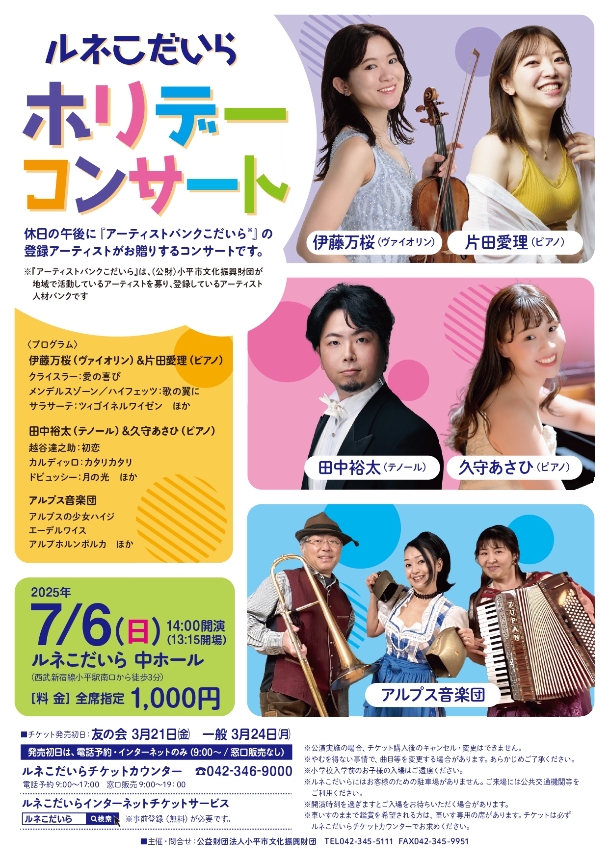 休日の午後に『アーティストバンクこだいら』の登録アーティストがお贈りするコンサートです。
