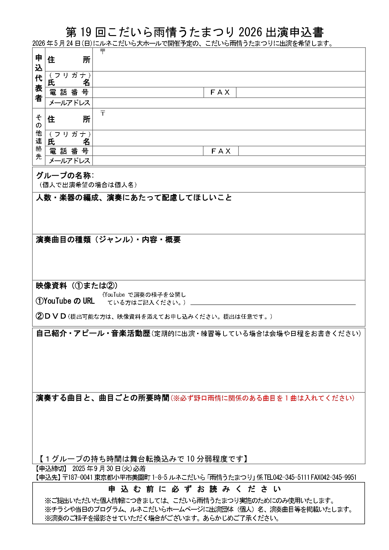 2026年5月24日(日)にルネこだいら大ホールで開催予定の、こだいら雨情うたまつりに出演する団体を募集します。