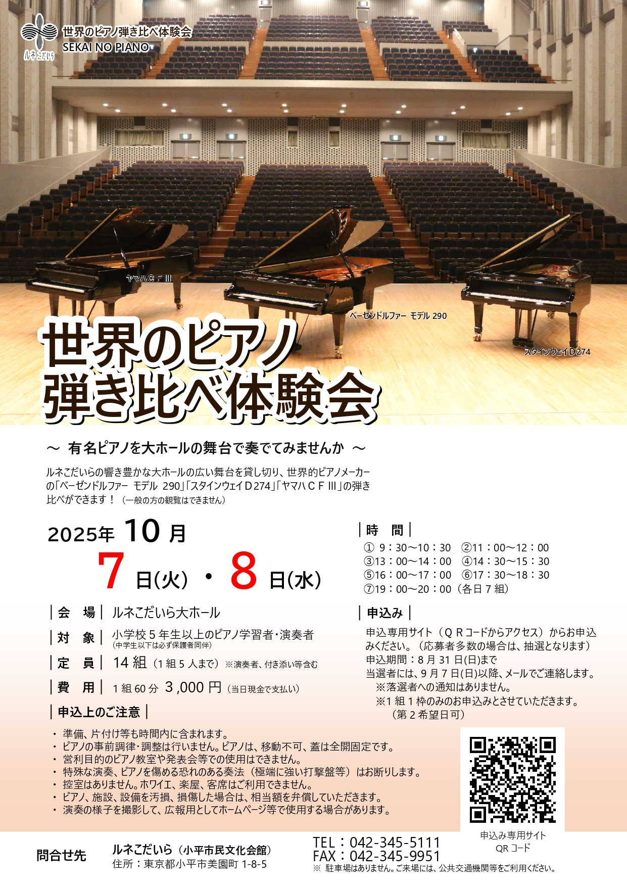 ルネこだいらの響き豊かな大ホールの広い舞台を貸し切り、世界的ピアノメーカーの、ベーゼンドルファー モデル290、スタインウェイD274、ヤマハCFⅢの弾き比べができます。※一般の方の観覧はできません。