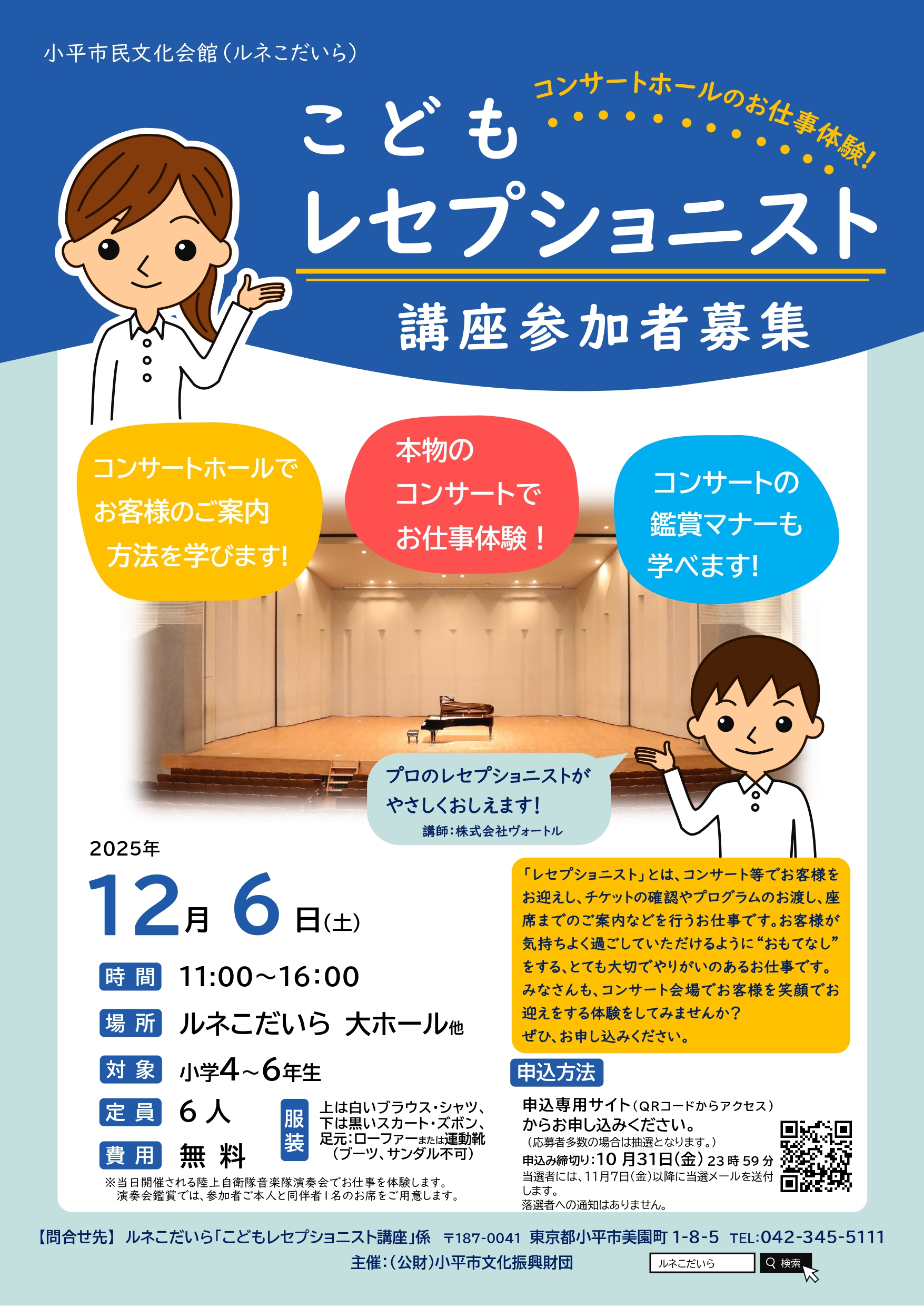 レセプショニストは、コンサート等でお客様をお迎えし、チケットもぎりやプログラム渡し、座席へのご案内など、会場で気持ちよく過ごしていただけるようにおもてなしをするお仕事です。ぜひお気軽にお申し込みください。