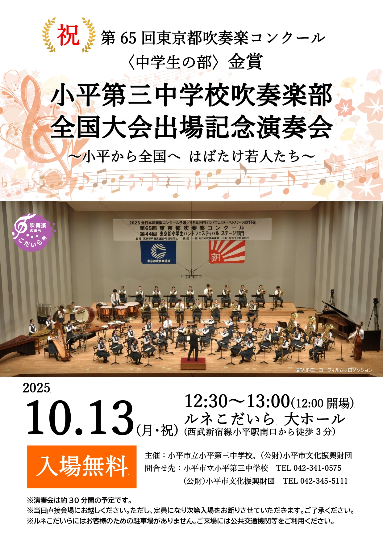 小平第三中学校吹奏楽部が、第65回東京都吹奏楽コンクール中学校の部で金賞を受賞し、全国大会への出場を決めたことを祝福する記念演奏会を開催します。