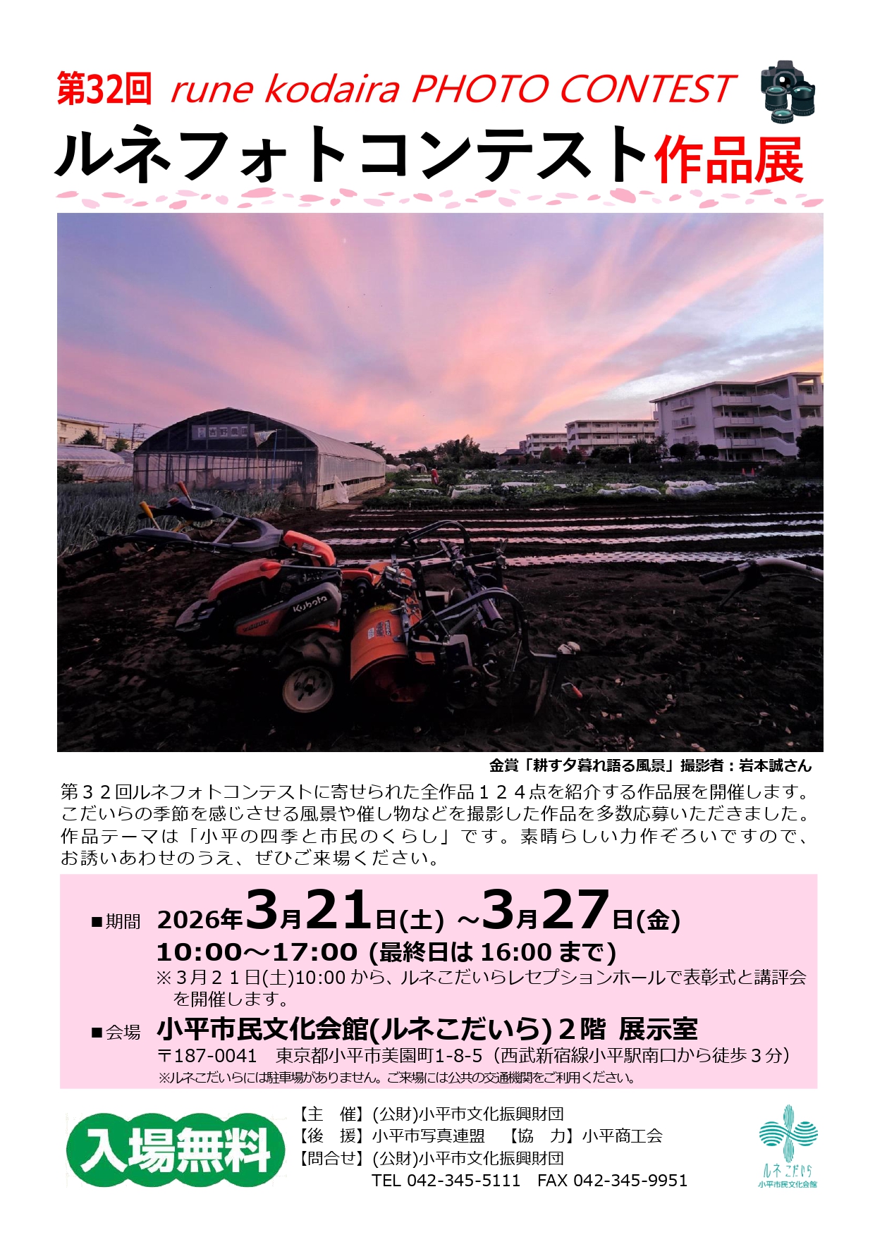 第32回ルネフォトコンテストに寄せられた全作品124点を紹介する作品展を開催します。こだいらの季節を感じさせる風景や催し物などを撮影した作品を多数応募いただきました。